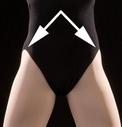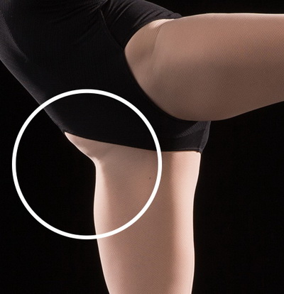 A high cut leotard reveals where the hip is at the top of the leg and breaks the line of the leg. See how the bend at the hip breaks the line of the leg and makes the thigh look wider in the first two pictures, where the ballet cut leotard covers the area in question.